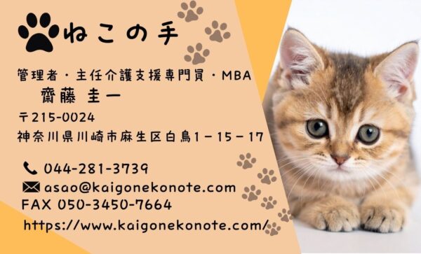 実は、これが私たちの狙いでもあります。 介護の相談は、ご本人やご家族にとって勇気がいることです。だからこそ、まずはこの名刺が「ねこの手」を借りるための、安心の架け橋になればいいなと思っています。